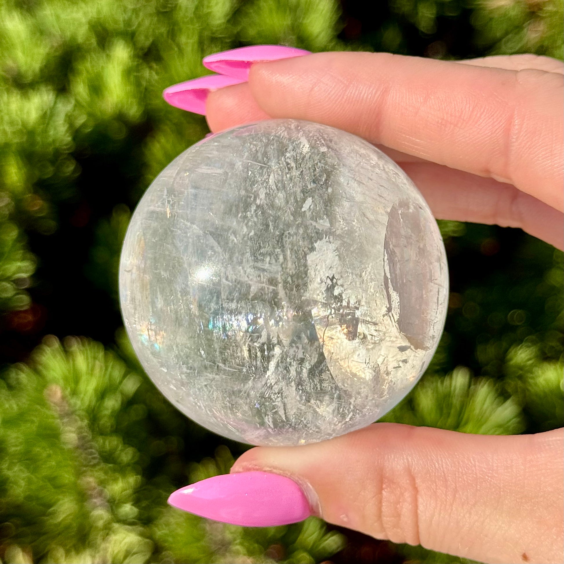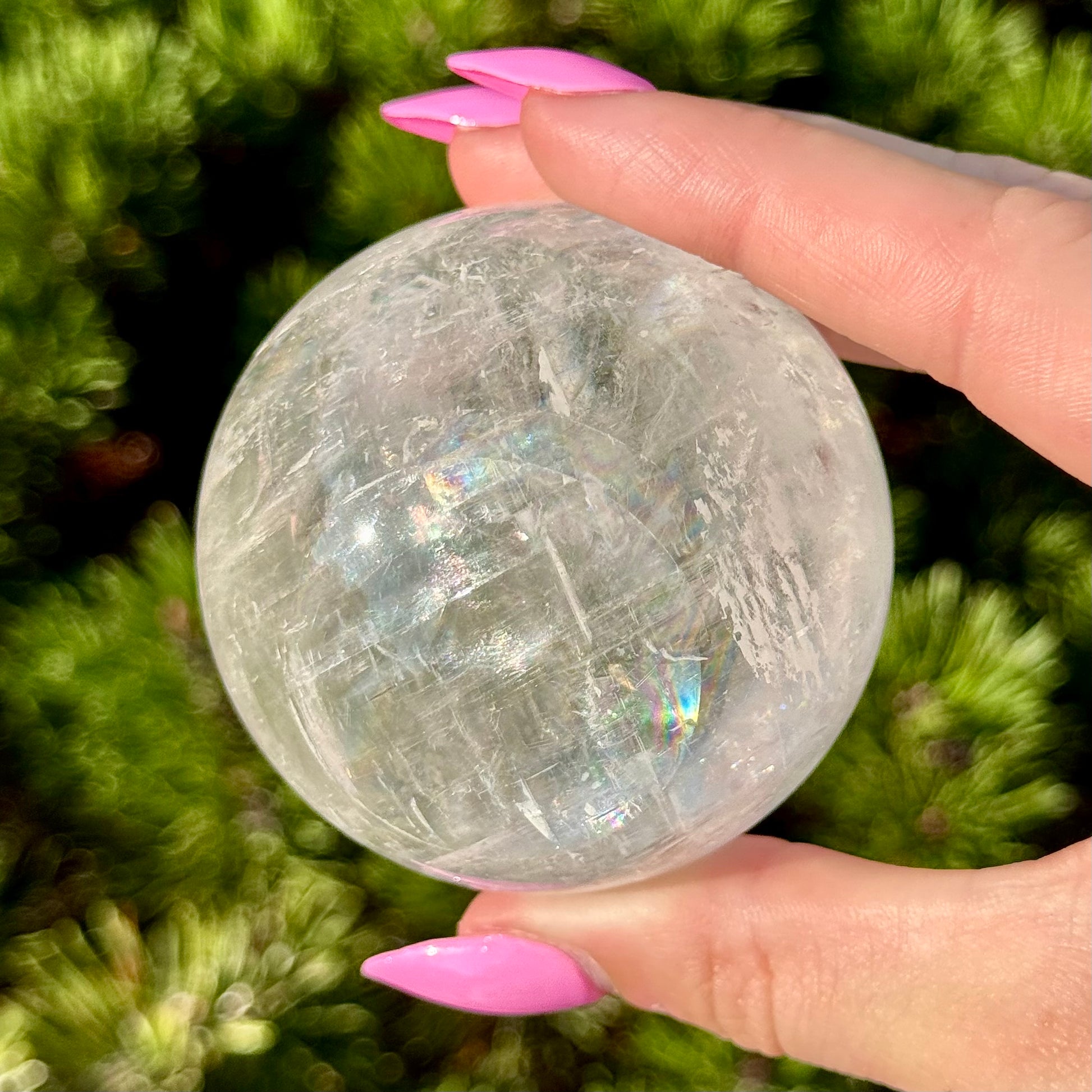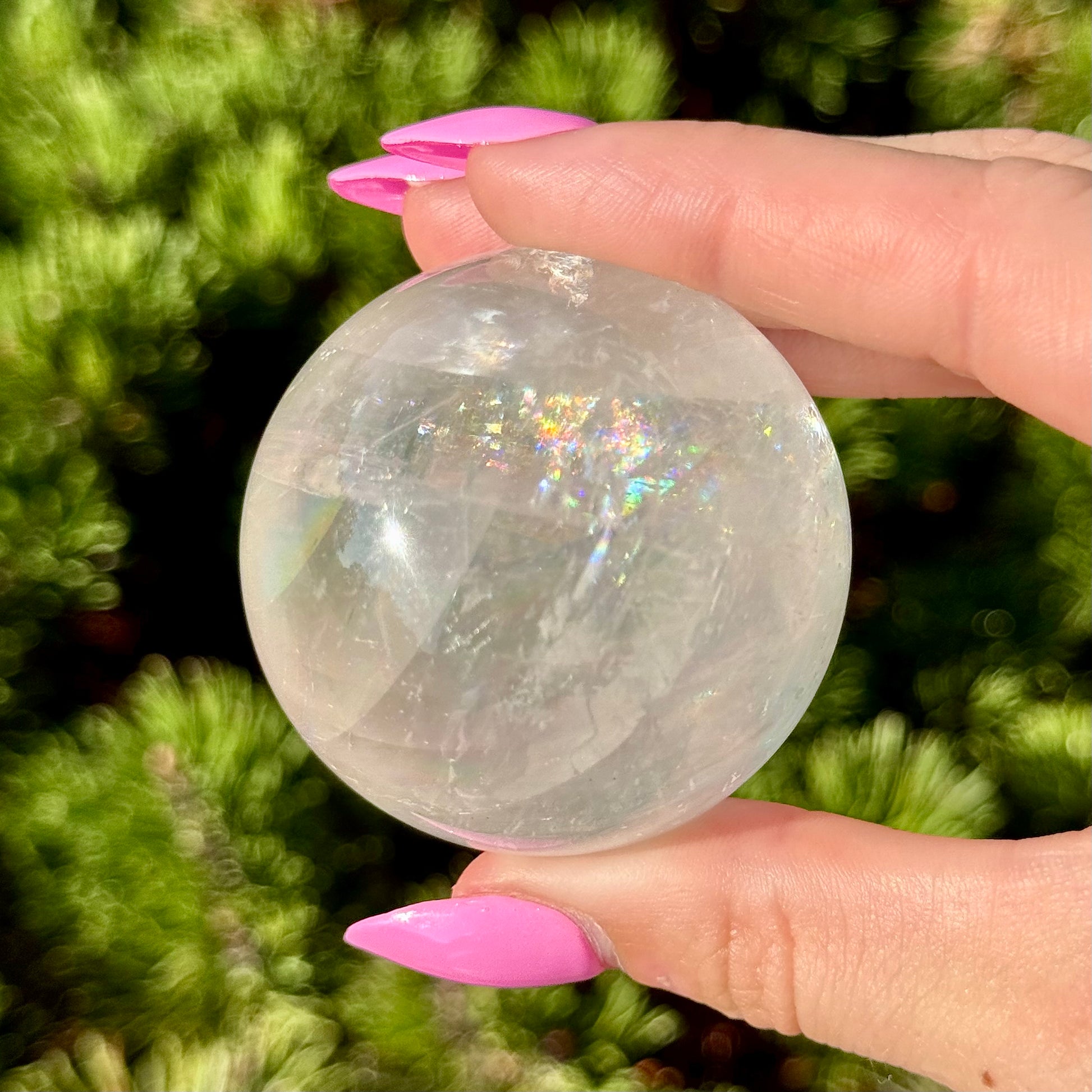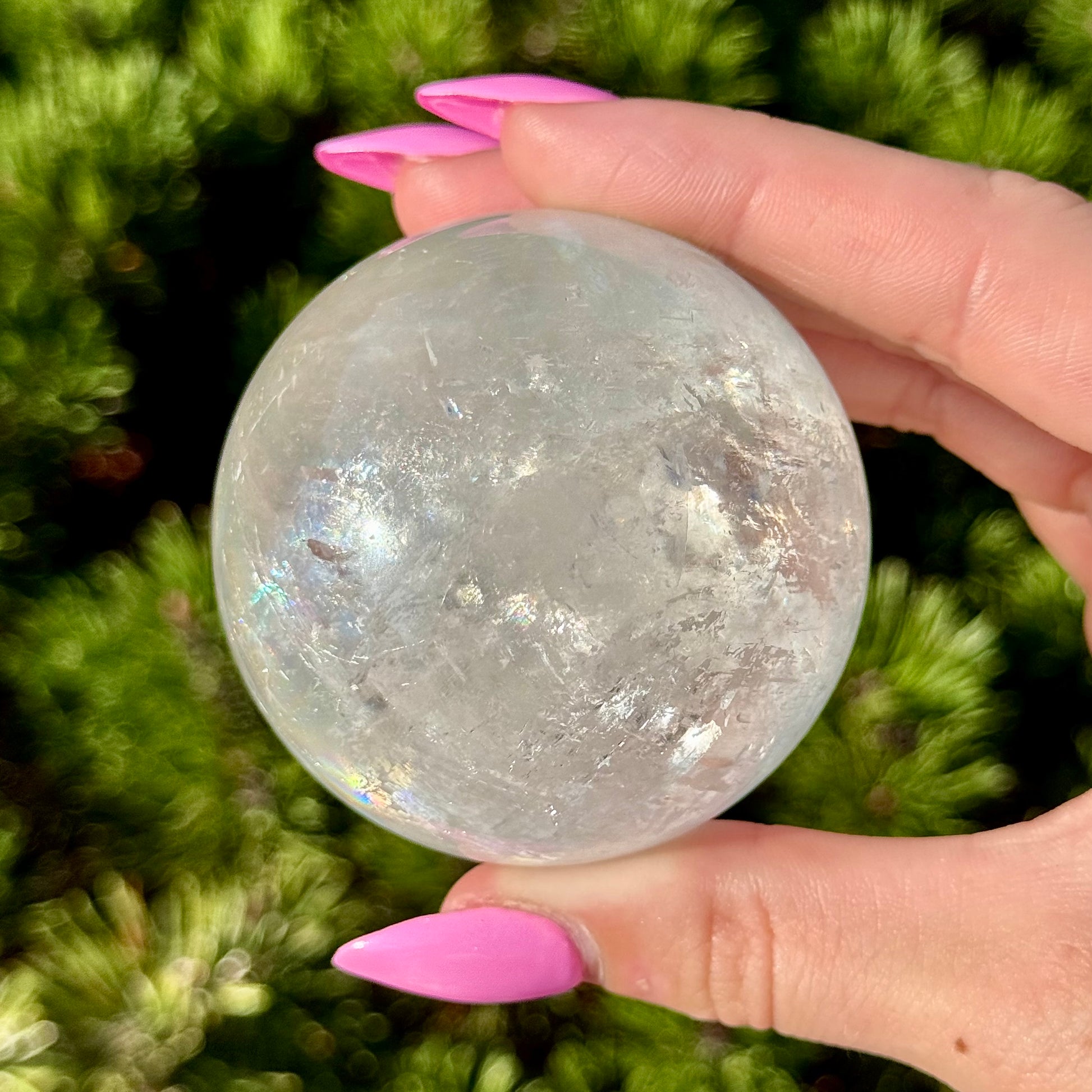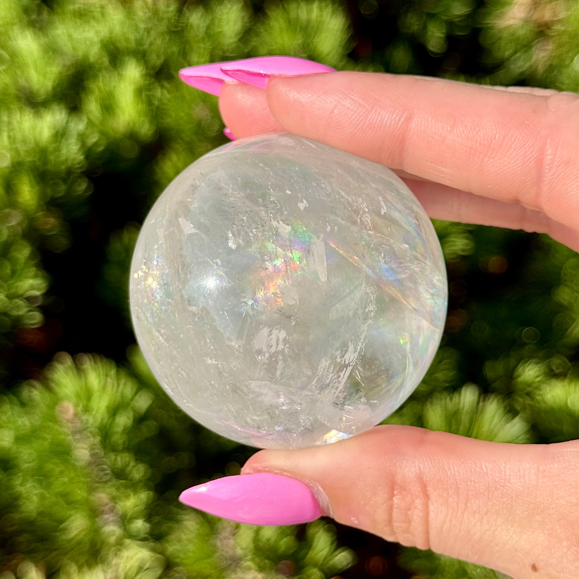 These Optical Calcite Spheres have diameters ranging from 49mm to 61mm. They dazzle with bright flash and vibrant rainbows!