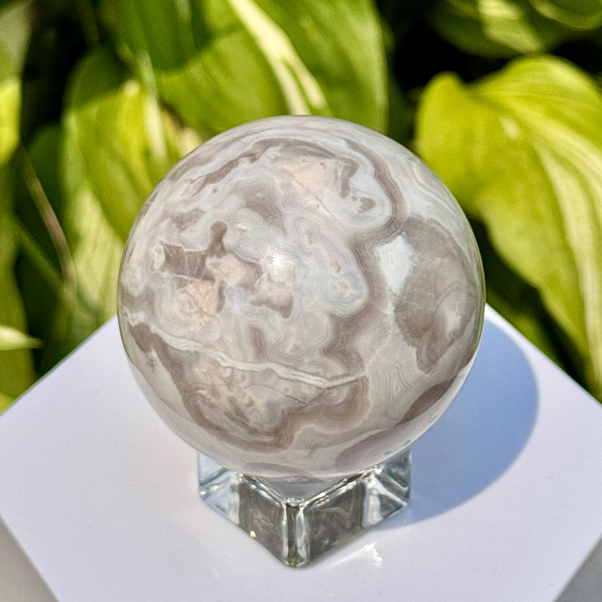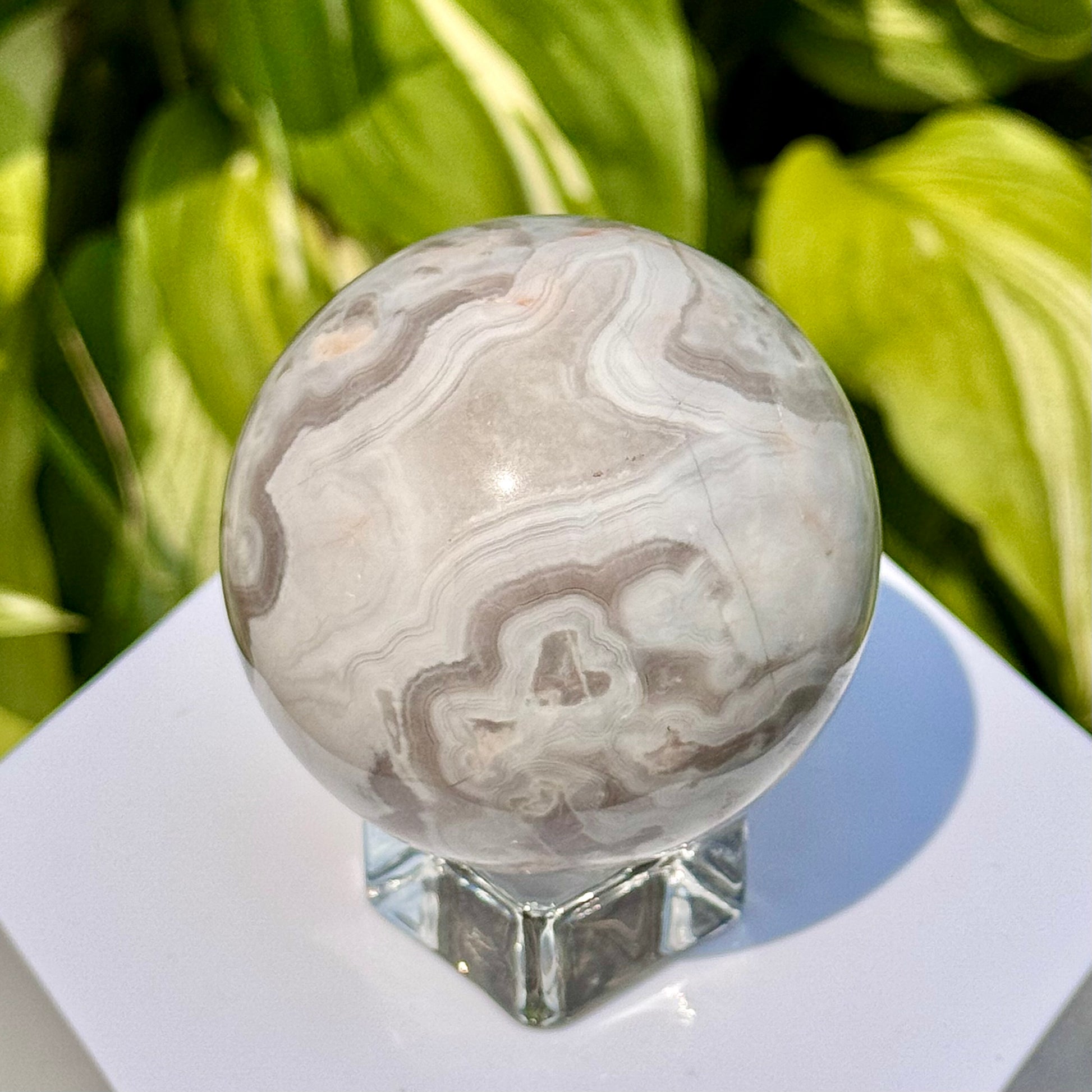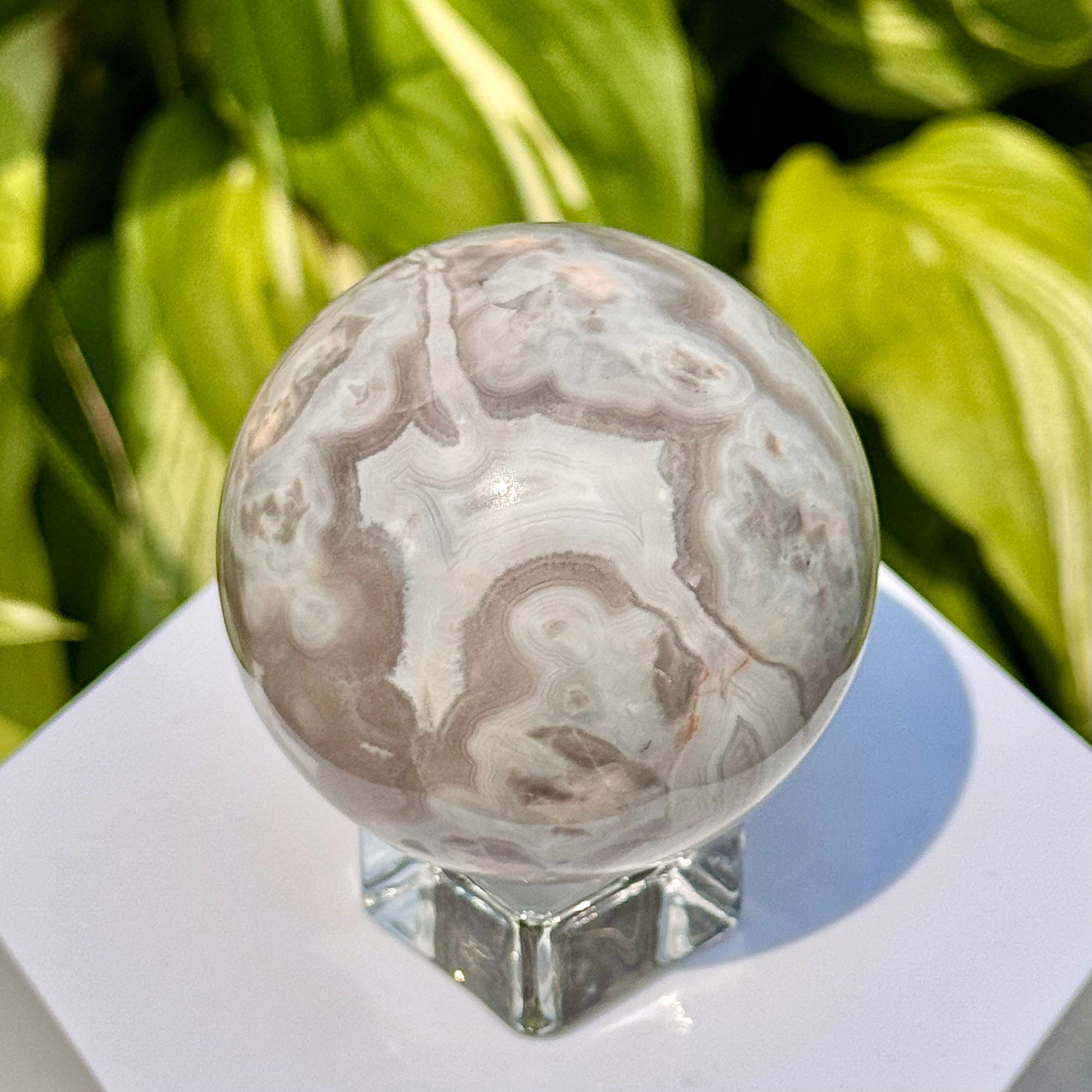 This White Crazy Lace Agate Sphere is 59mm in diameter.