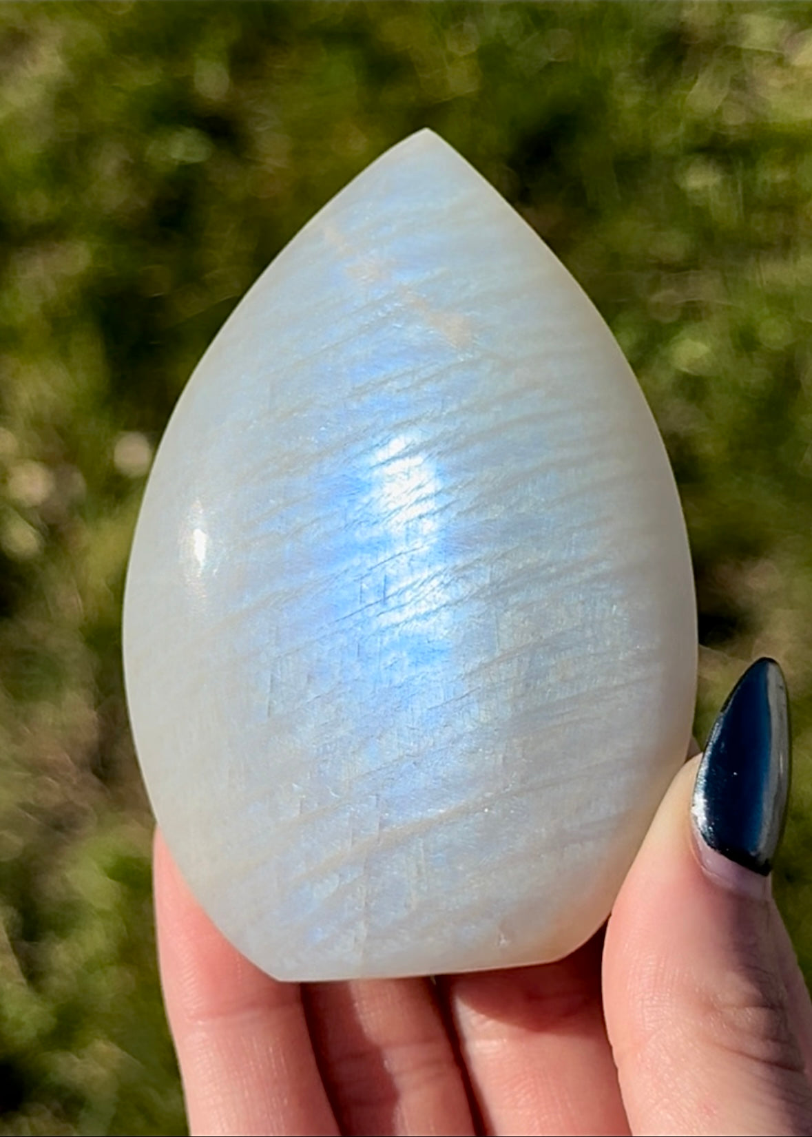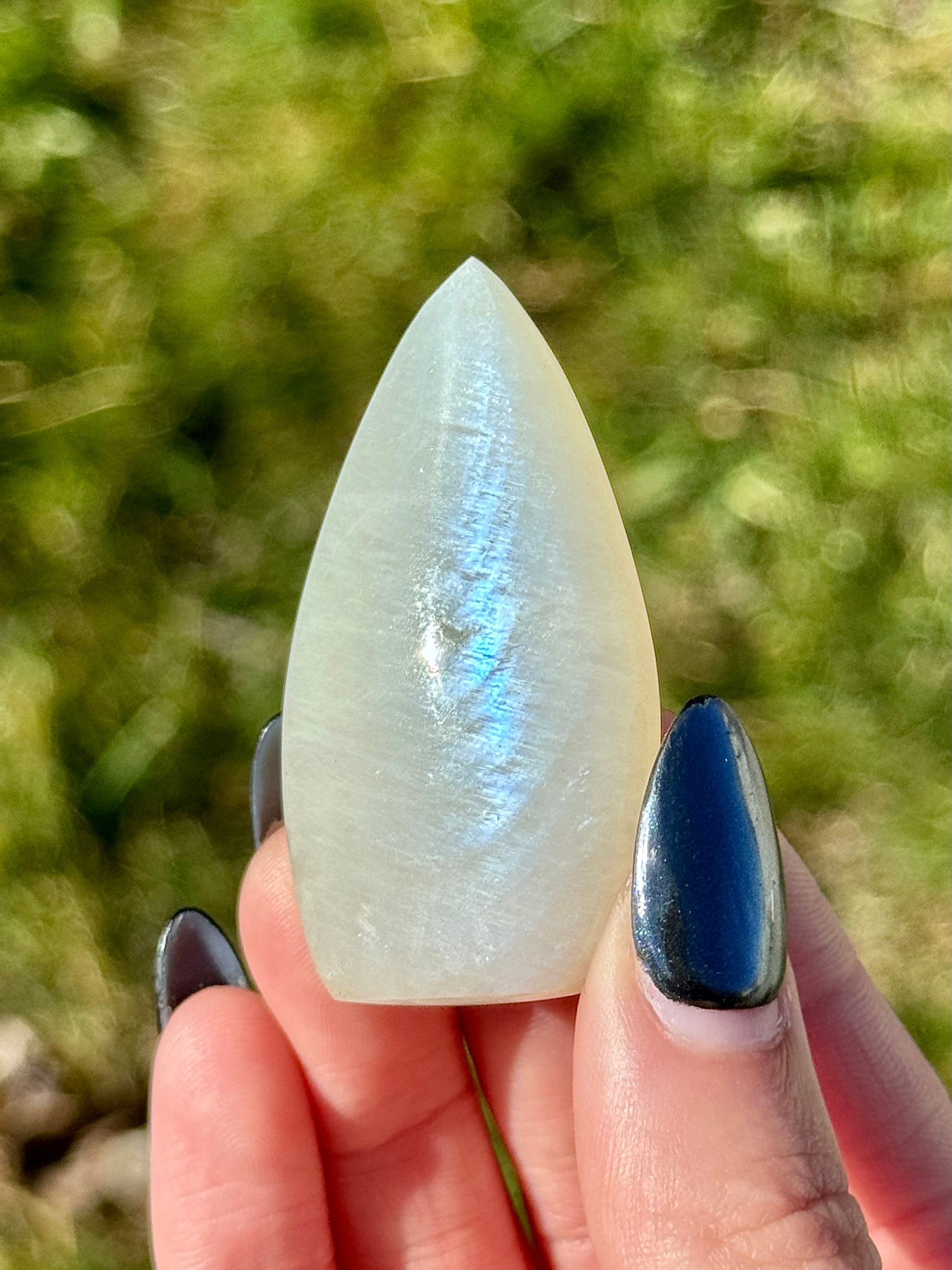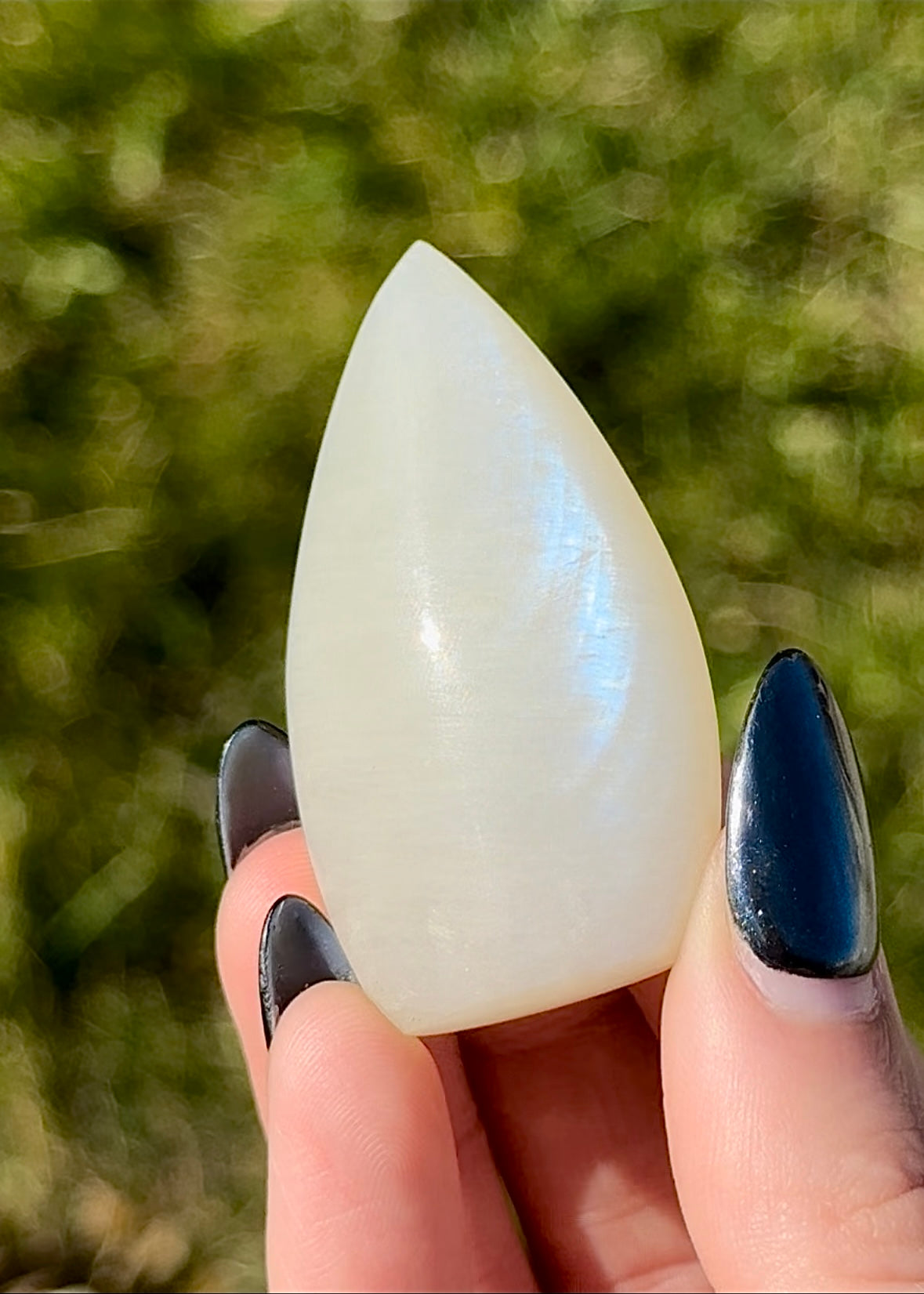 Gaze at these gorgeous White Moonstone Flames and be mesmerized by their perfect blue flash! These handpicked flames have a clean, shiny surface on both sides and range from 2 1/2" to 3 1/4" tall.