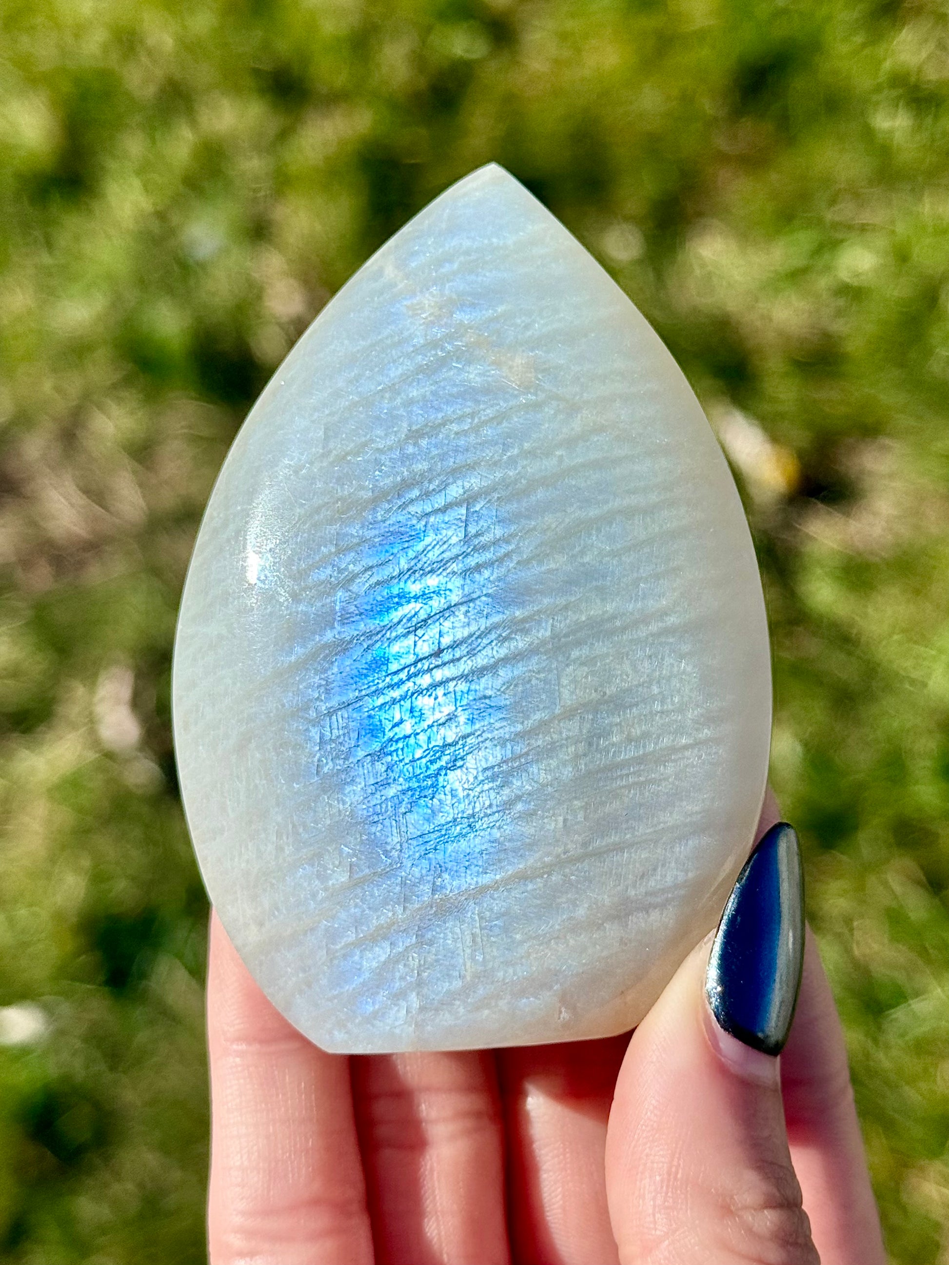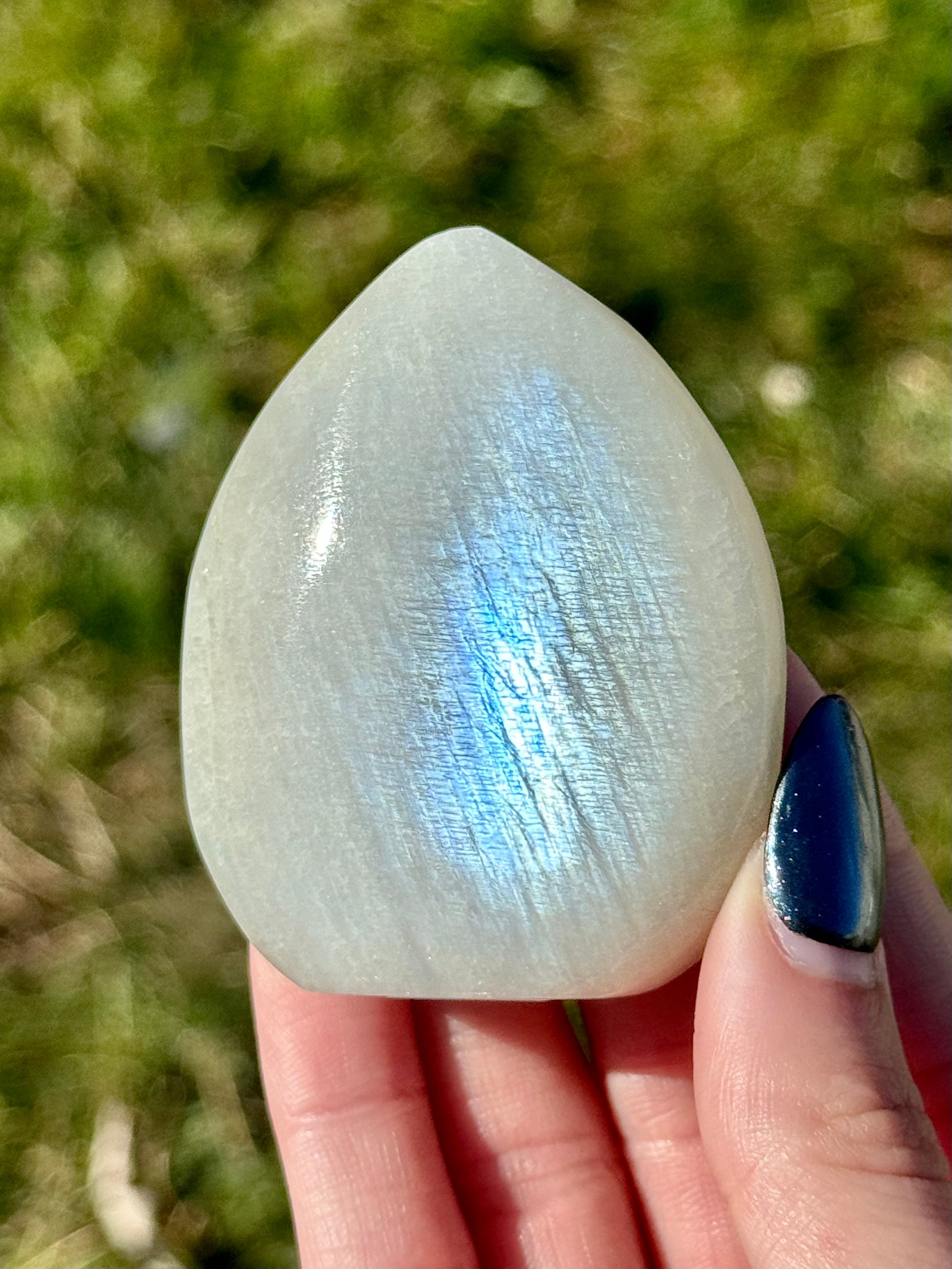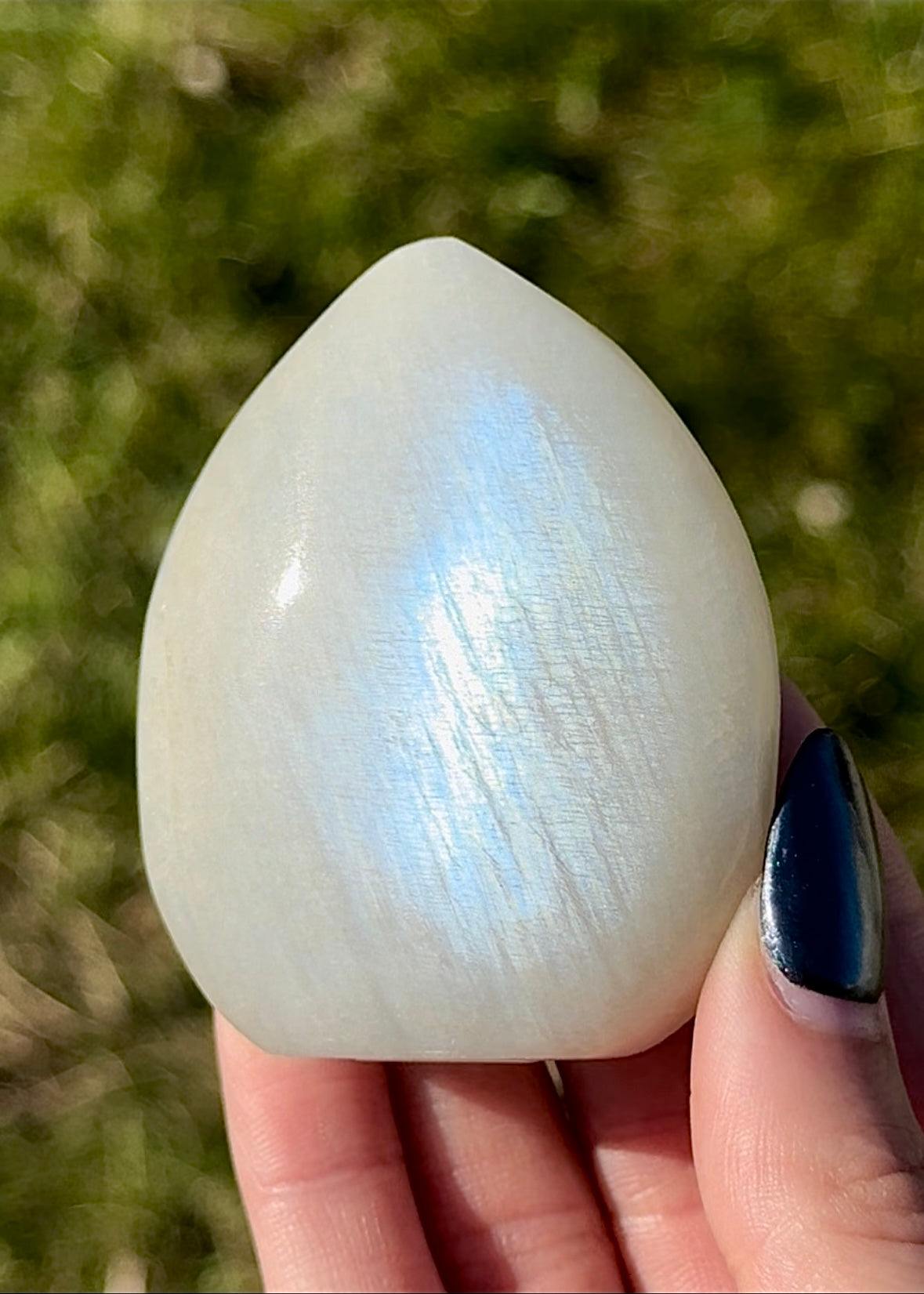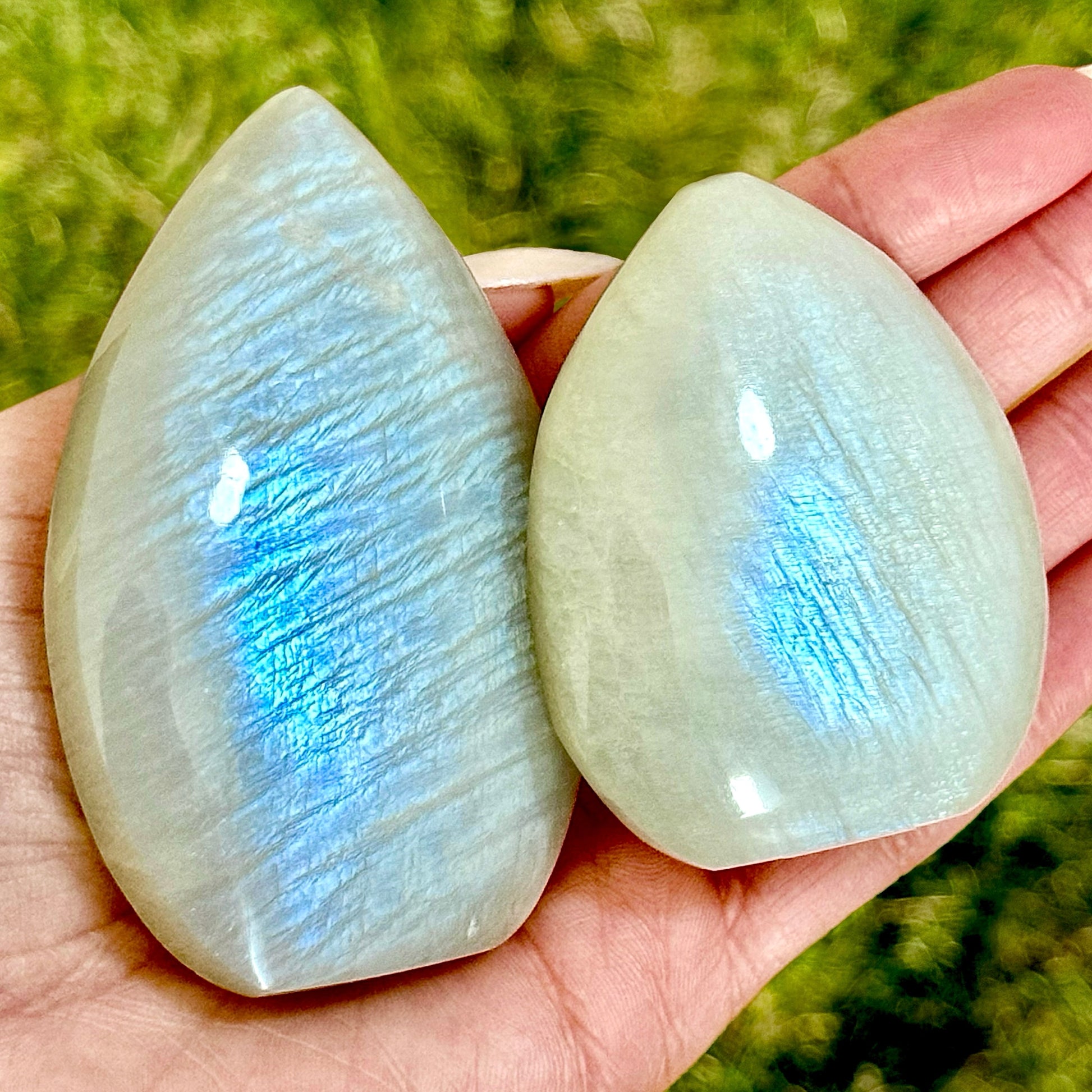Gaze at these gorgeous White Moonstone Flames and be mesmerized by their perfect blue flash! These handpicked flames have a clean, shiny surface on both sides and range from 2 1/2" to 3 1/4" tall.
