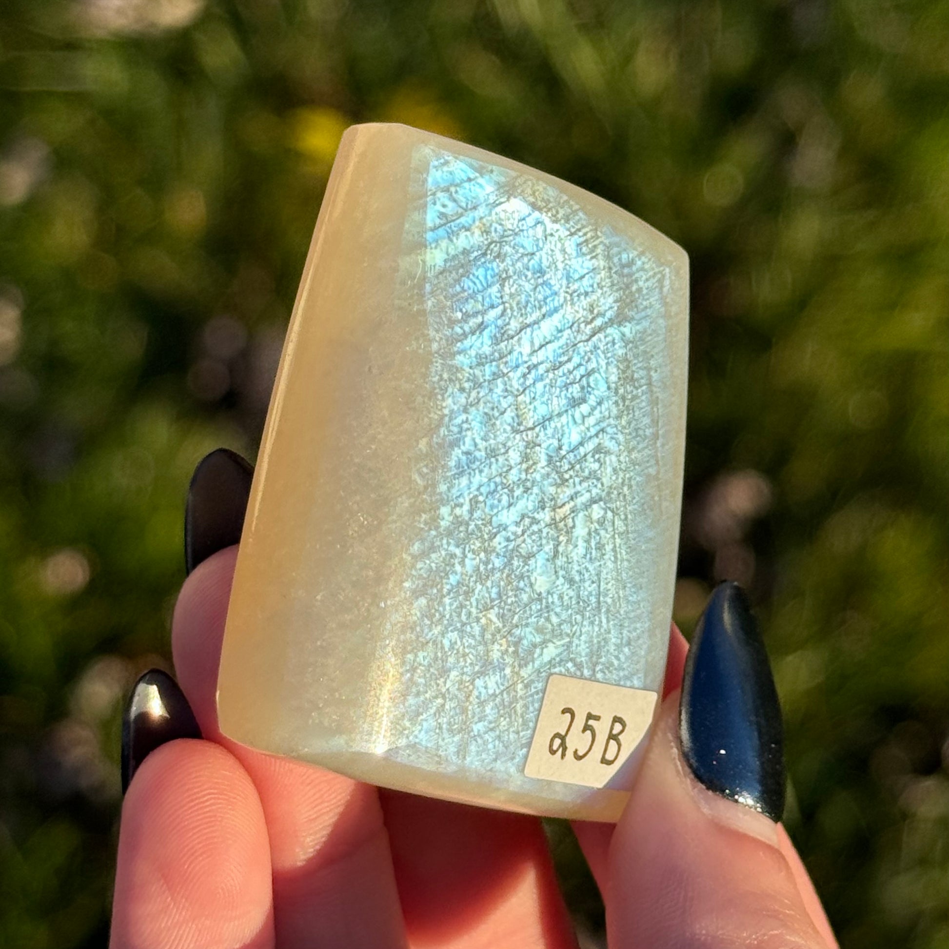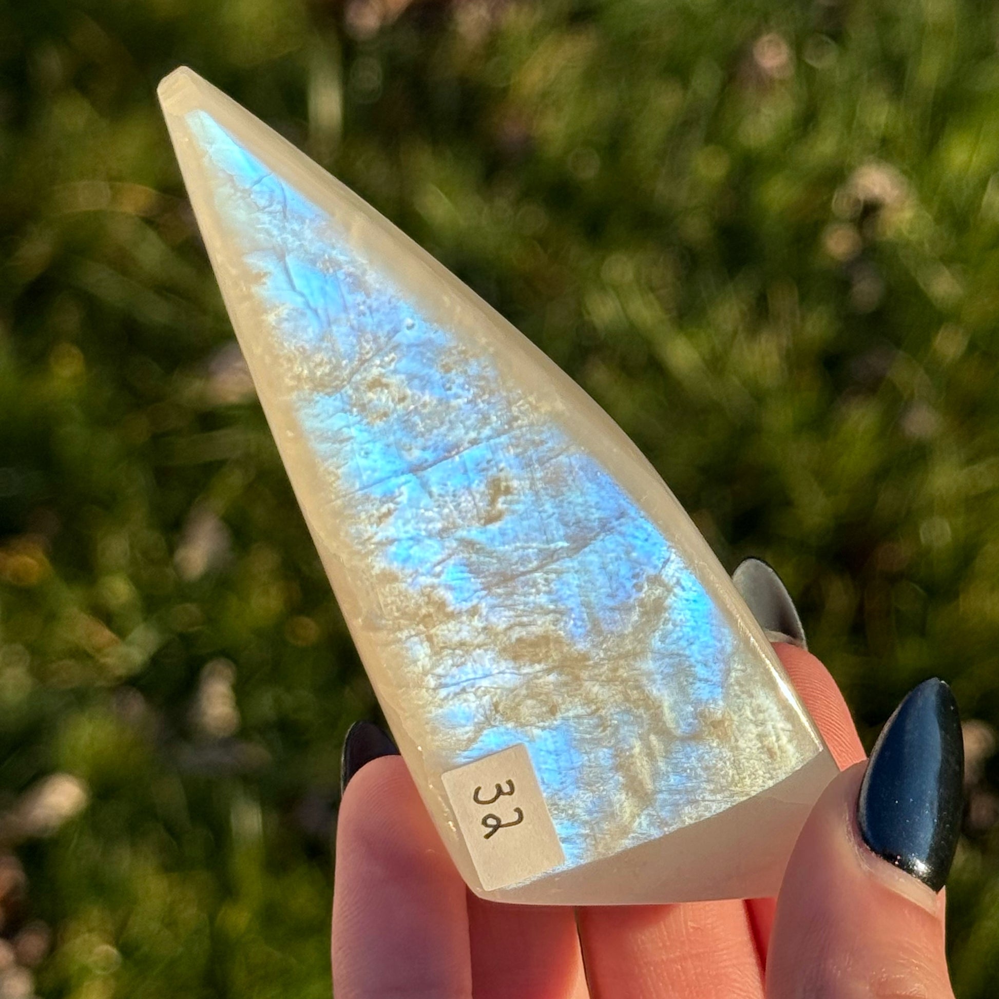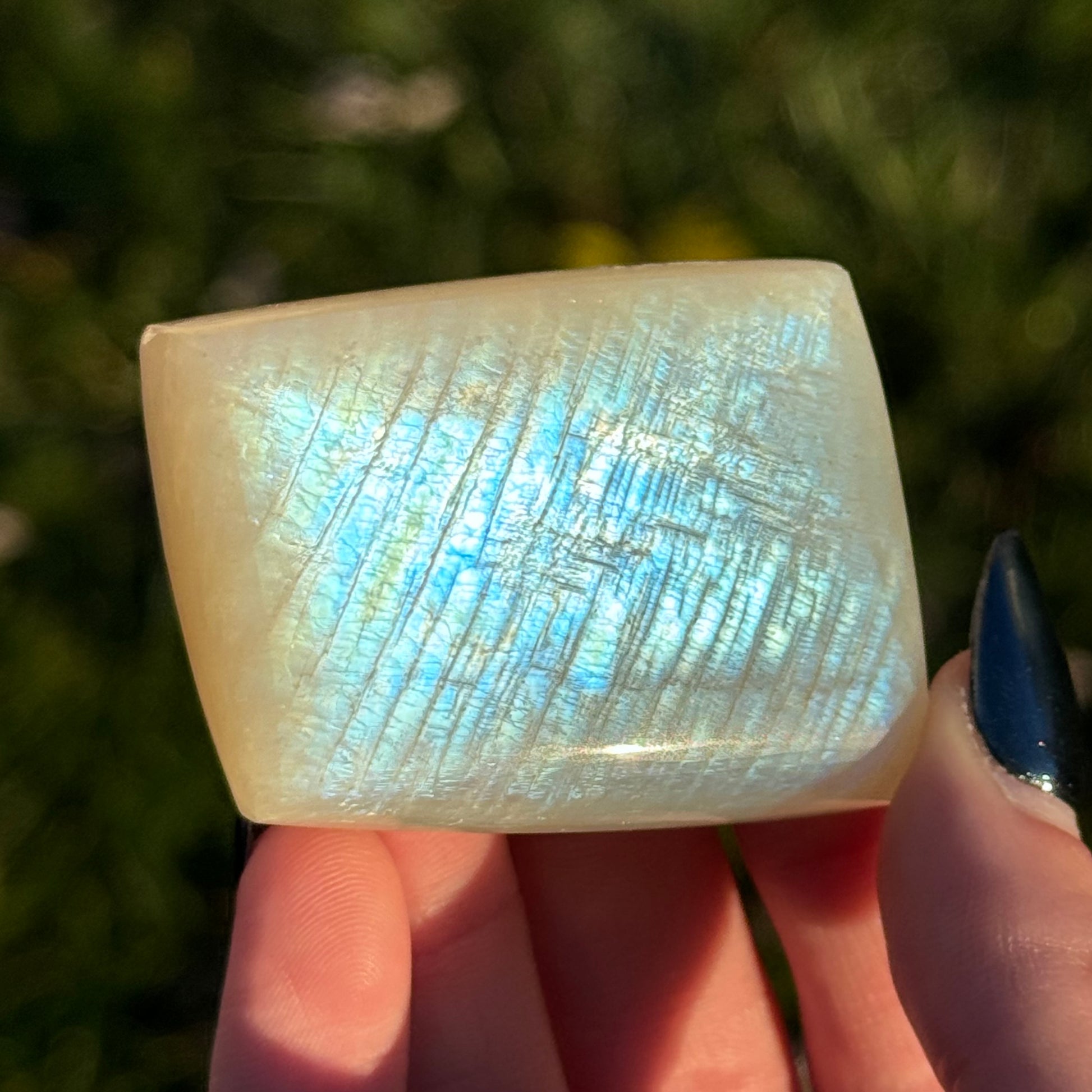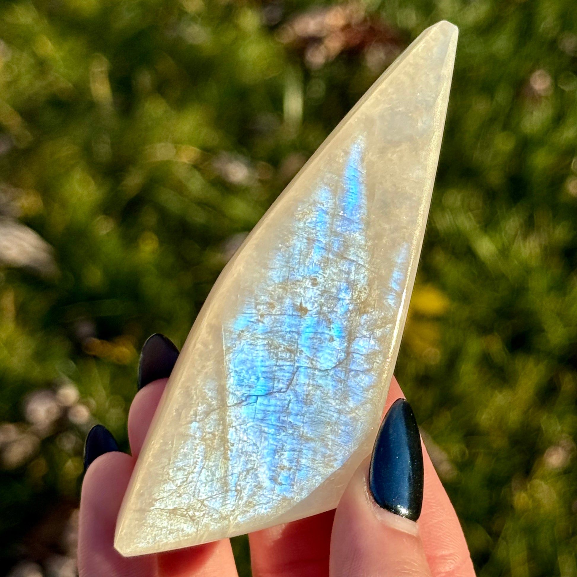 Find the perfect White Moonstone Freeform for you! Each piece has a beautiful, flawless blue flash on both sides.