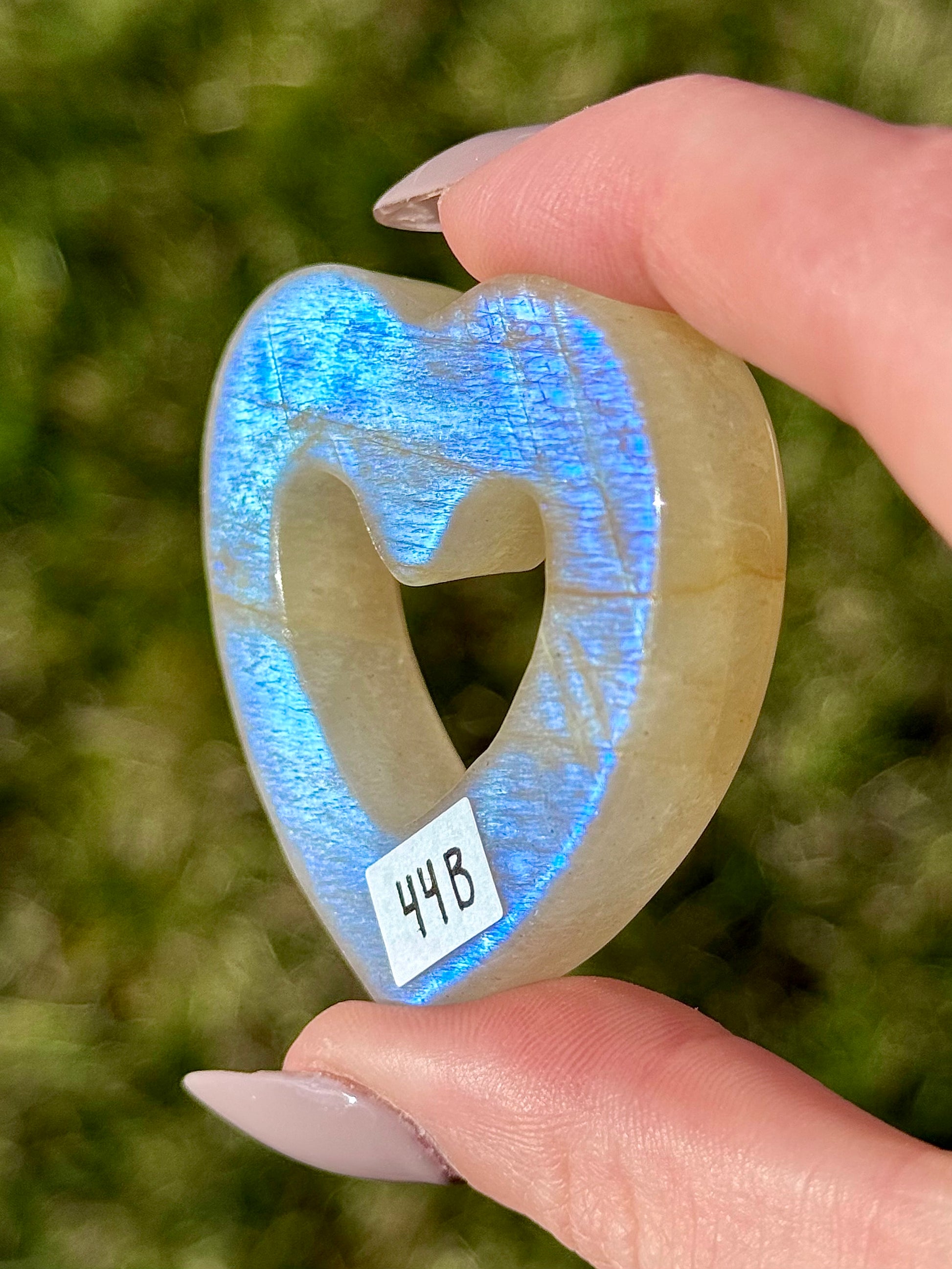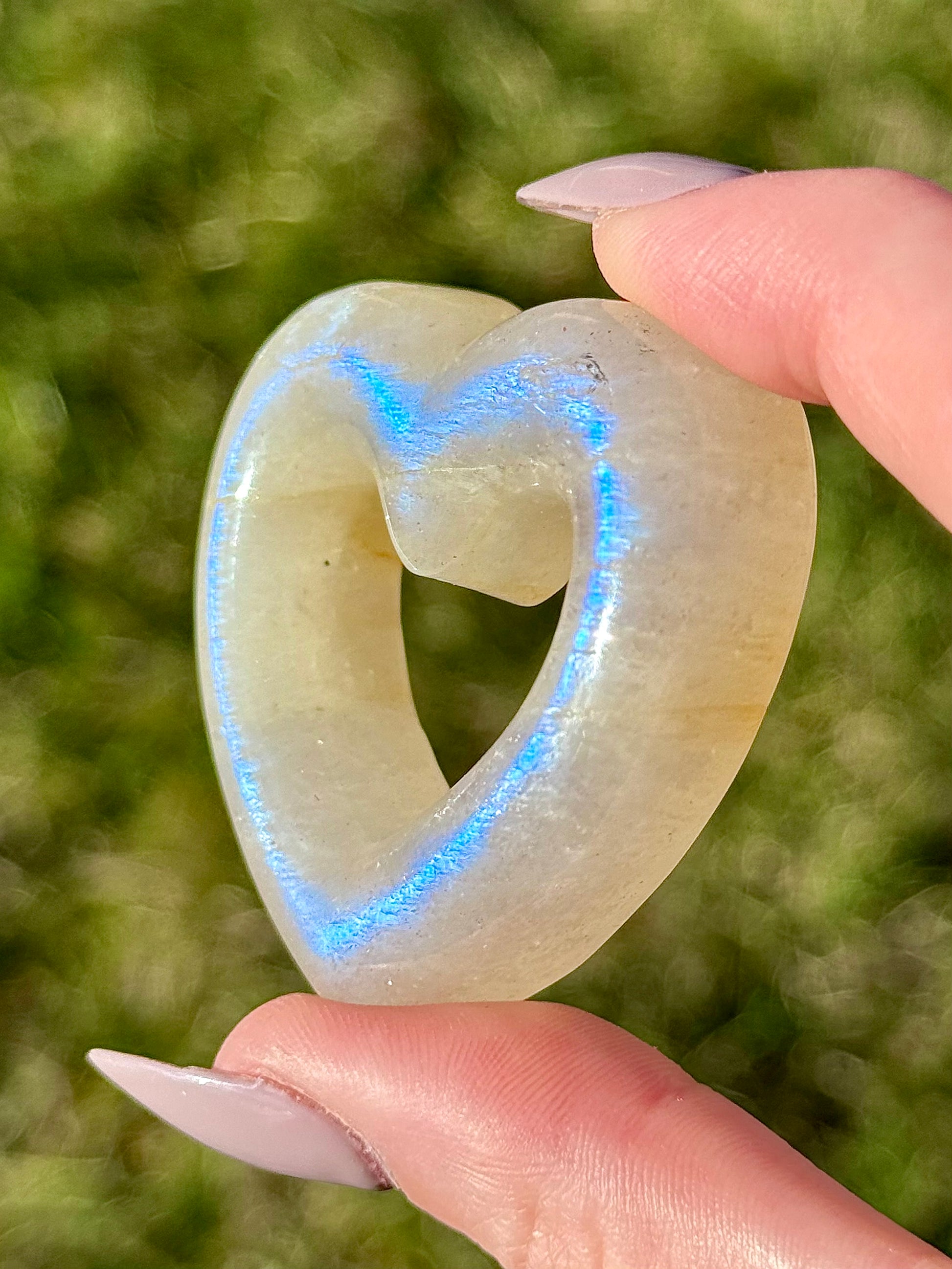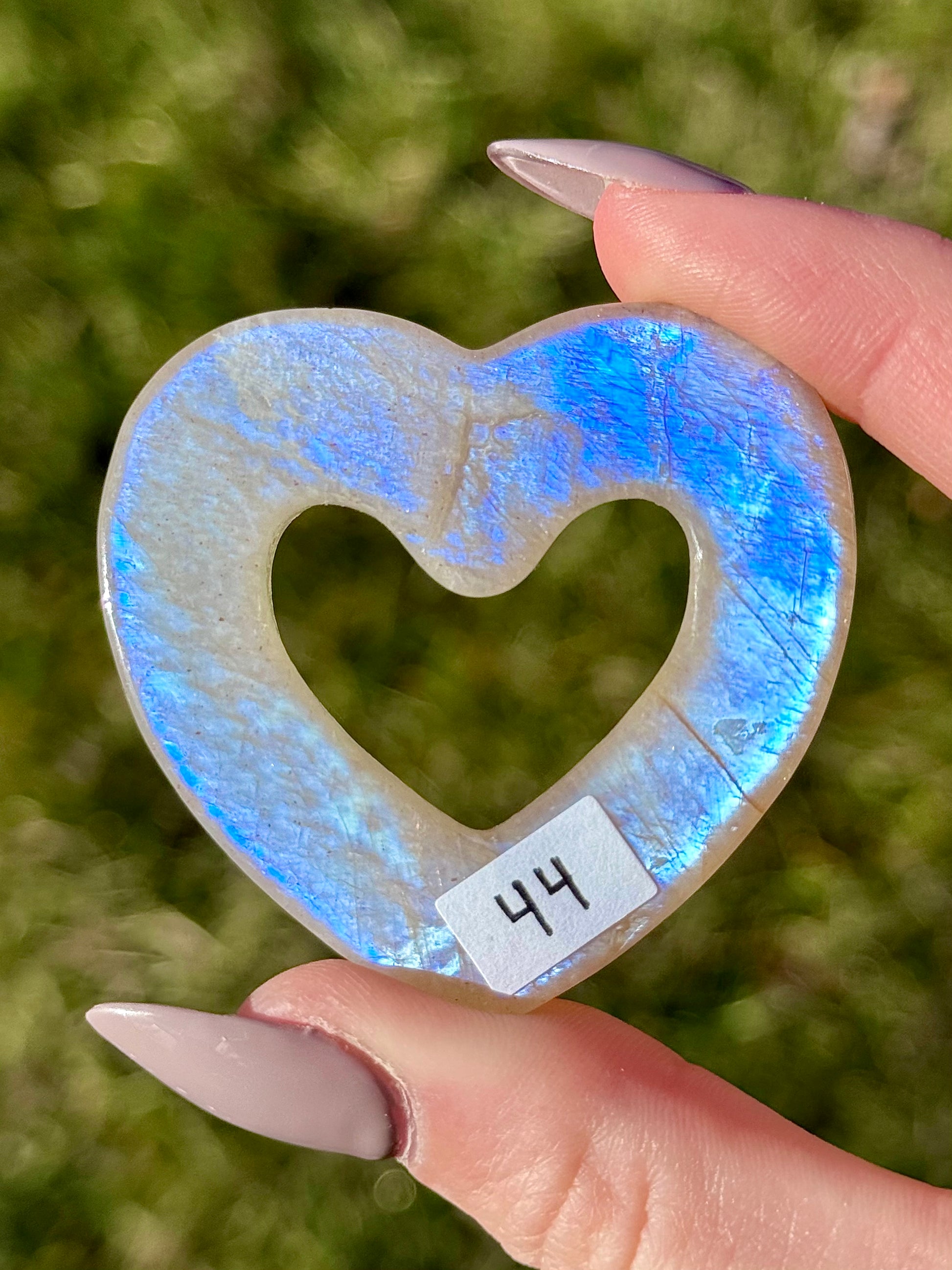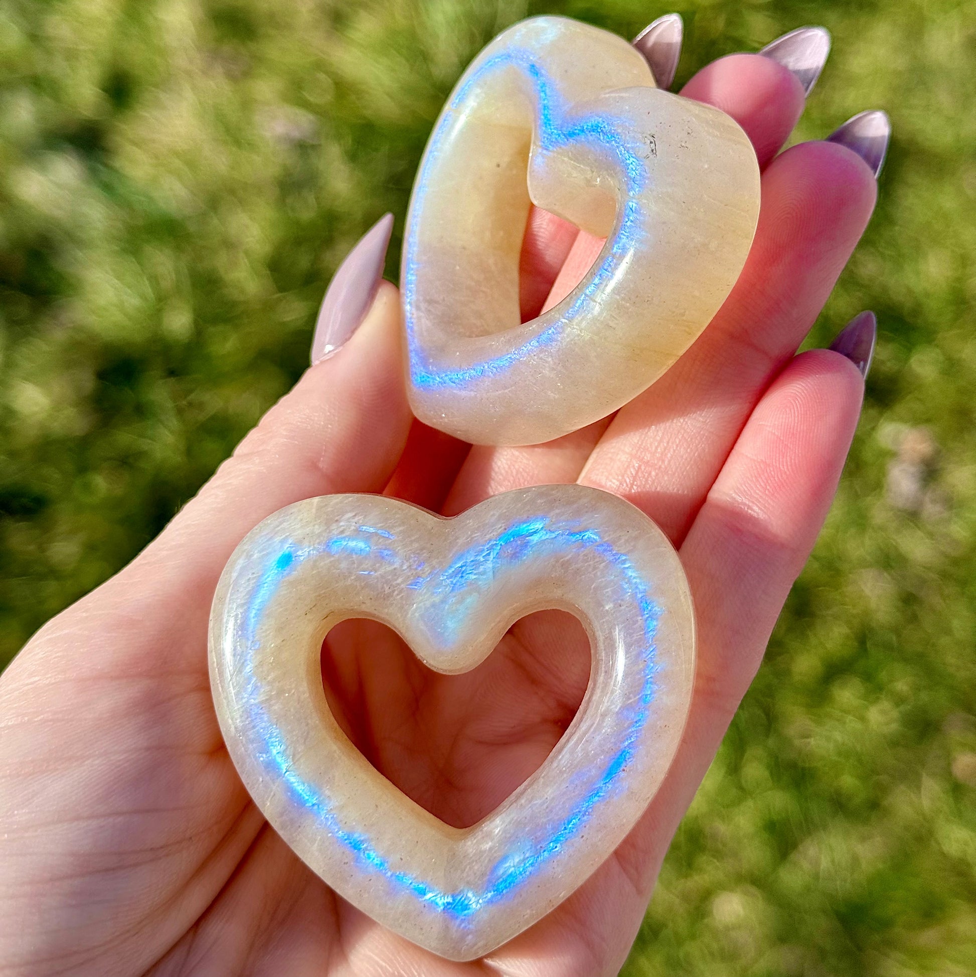 These White Moonstone Heart Outlines are very cute, unique carvings. They showcase deep blue flash on each side and measure 2" tall.